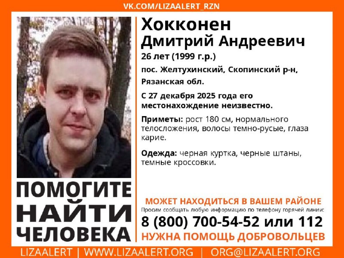 В Рязанской области пропал 26-летний Дмитрий Хокконен, объявлен поиск 27.12.2025