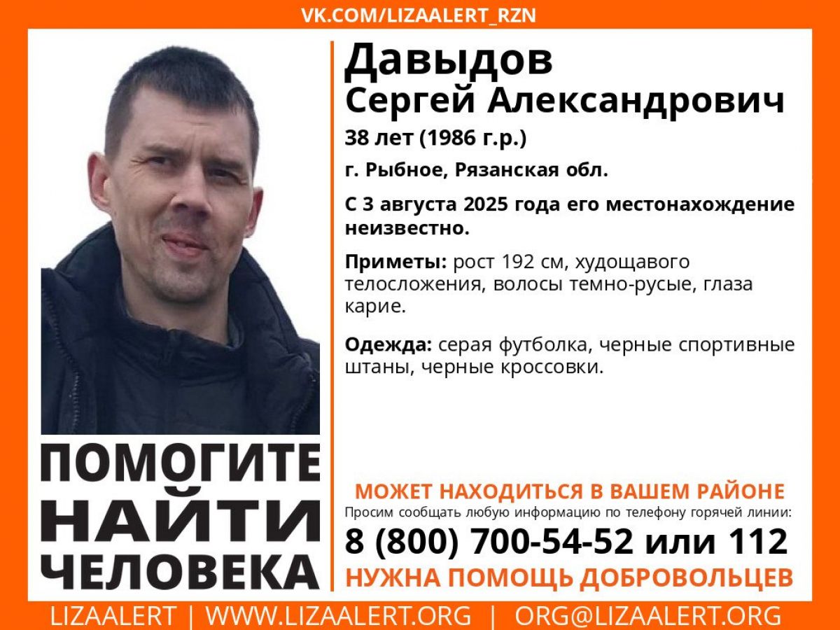 4 августа в городе Рыбное Рязанской области было зафиксировано исчезновение местного жителя. Давыдов Сергей 38-ми лет перестал выходить на связь накануне, 3 августа. На данный момент его местонахождение остается неизвестным, родственники и волонетры проводят активные поиски, сообщили в рязанском отряде "ЛизаАлерт".