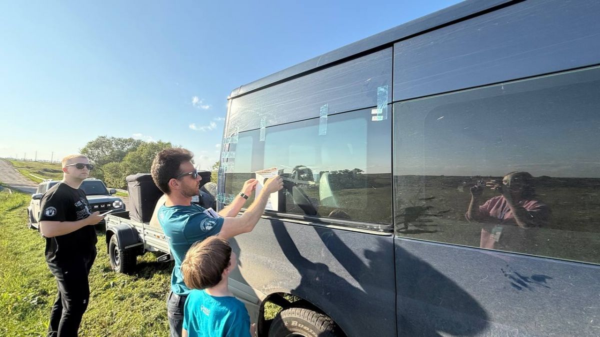 Пока мы общались Сергей вместе с другом и сыновьями наклеили на стекла автомобиля свой номер в соревнованиях. Также они оборудовали корзину и прикрепили номер на нее.