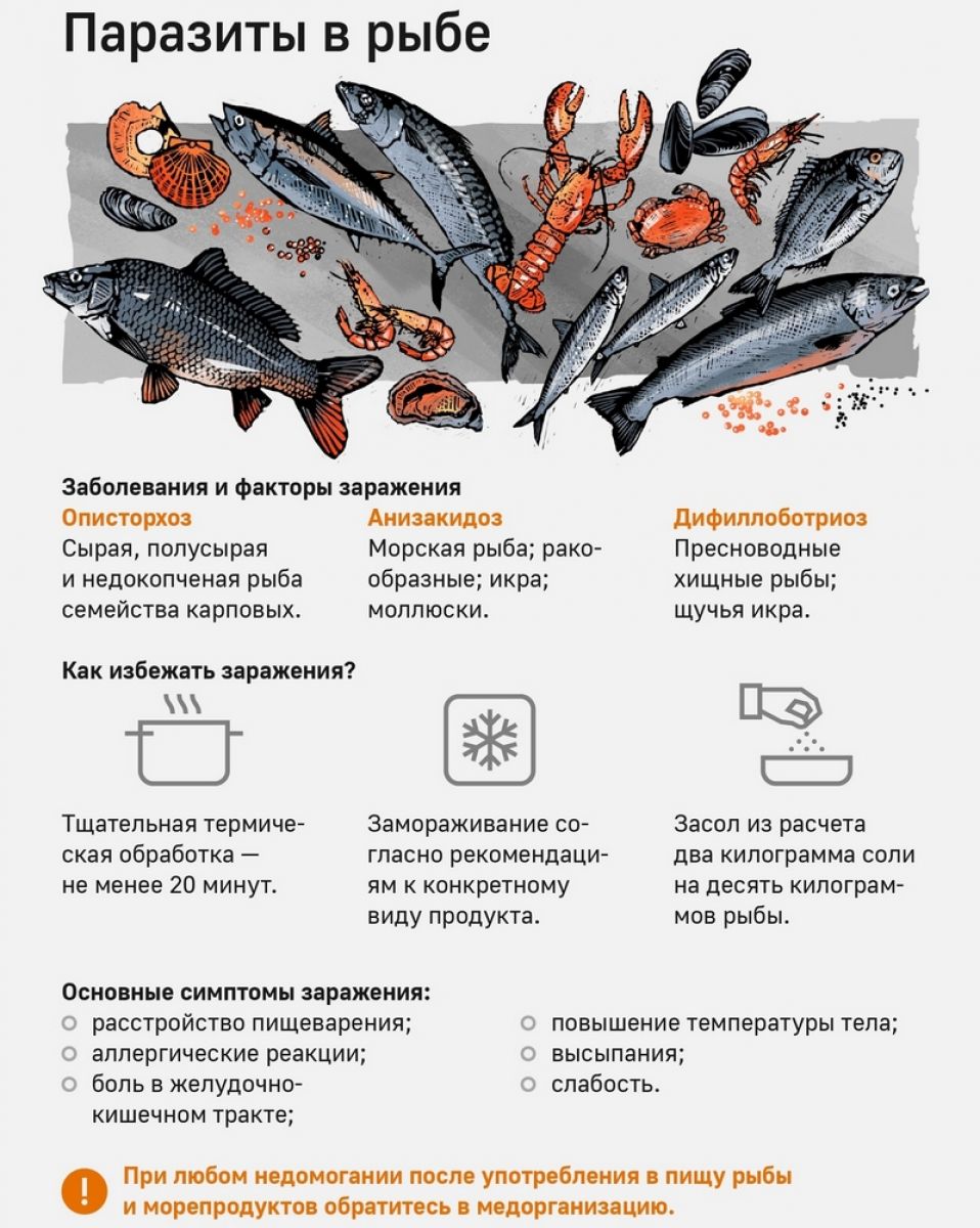 Минздрав напоминает рязанцам, что заражение описторхозом происходит при употреблении сырой, недоваренной, недожаренной или вяленой рыбы из семейства карповых. Следует употреблять в пищу только тщательно термически обработанную рыбу, приобретать рыбу и рыбные продукты в проверенных местах, облюдать правила хранения и приготовления.