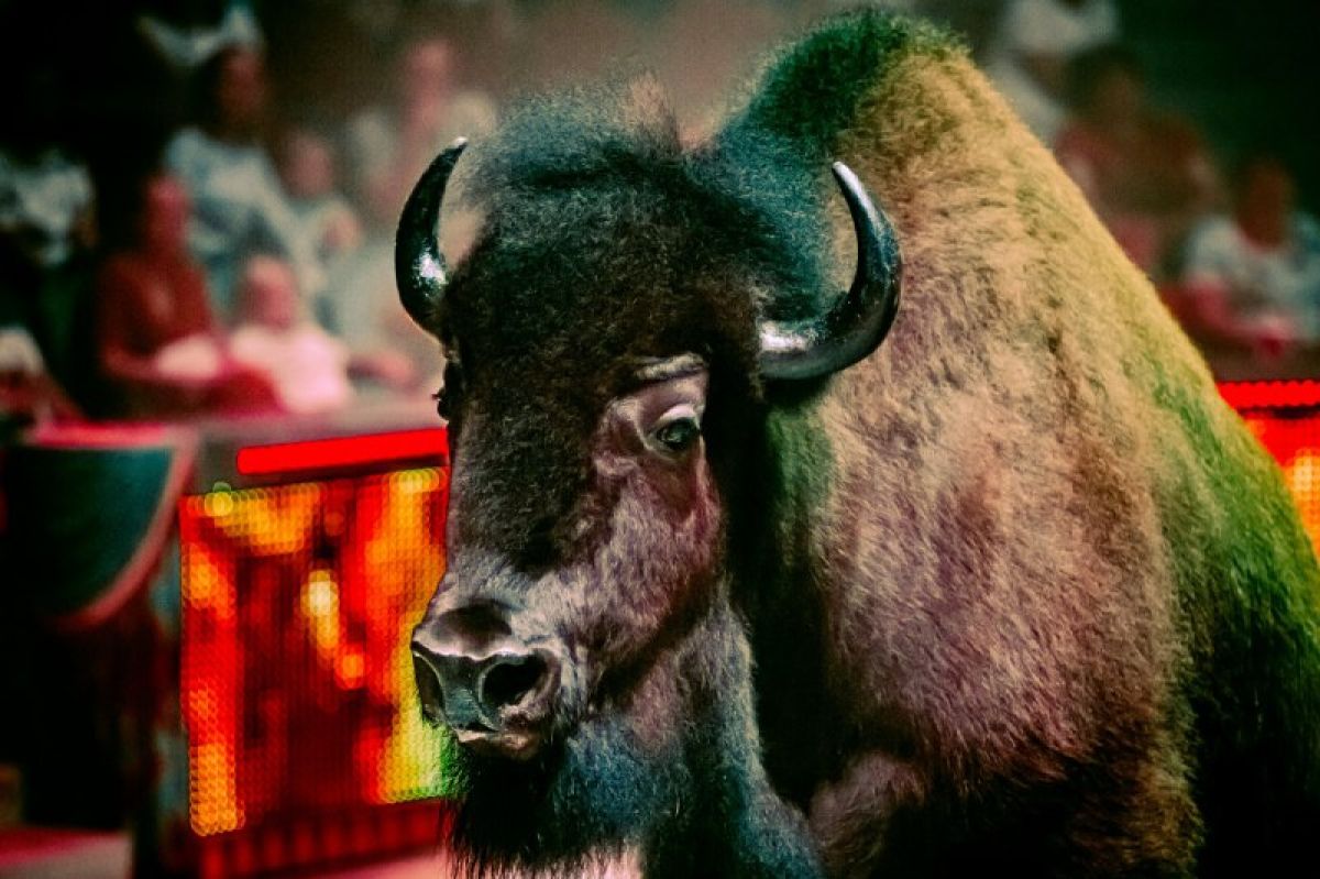 А еще в этом году зрителей ждет большое количество дрессированных животных: медведи, голуби, питоны, лошади, верблюды и единственный в России номер с группой канадских бизонов. Дрессирует канадских бизонов Рустам Газзаев. На пресс-встрече он поделился с гостями интересными фактами о работе с этими редкими для цирка животными: