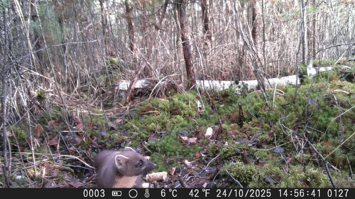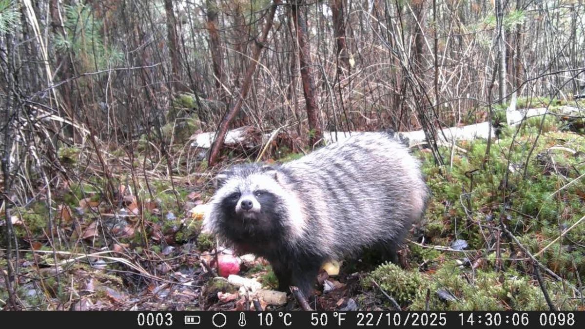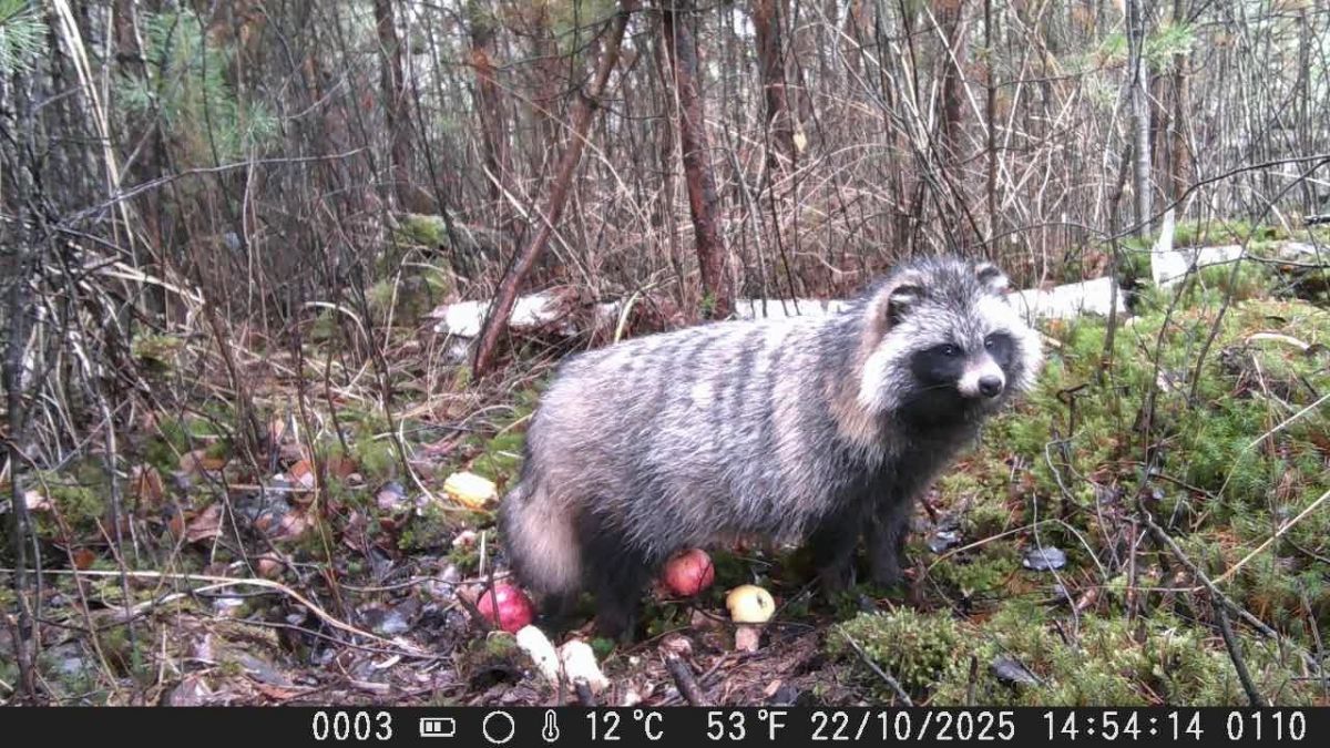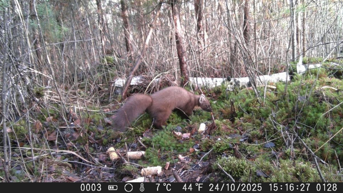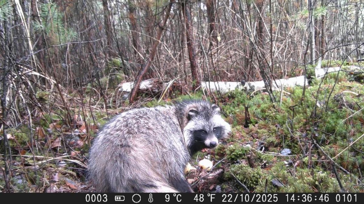 В Клепиковском районе Рязанской области на территории Мещёрского национального парка фотоловушки засняли енотовидную собаку и куницу. Кадры опубликовал на странице в социальной сети Андрей Андрианов.