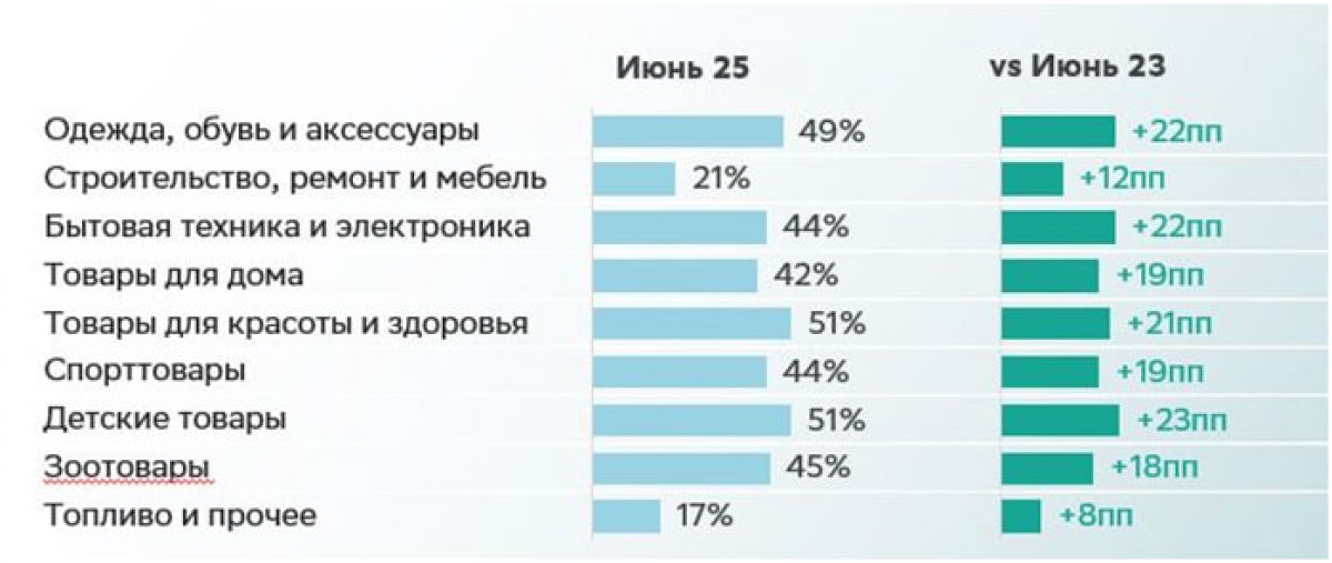Внутри торговли непродовольственными товарами влияние маркетплейсов распространяется неравномерно. Наибольшее проникновение отмечается в популярных категориях товаров, таких как одежда (почти половина объёма), бытовая техника (44%) и товары для дома (42%). Товары для строительства и ремонта также ощутили воздействие платформ — около четверти продаж теперь приходится на маркетплейсы.