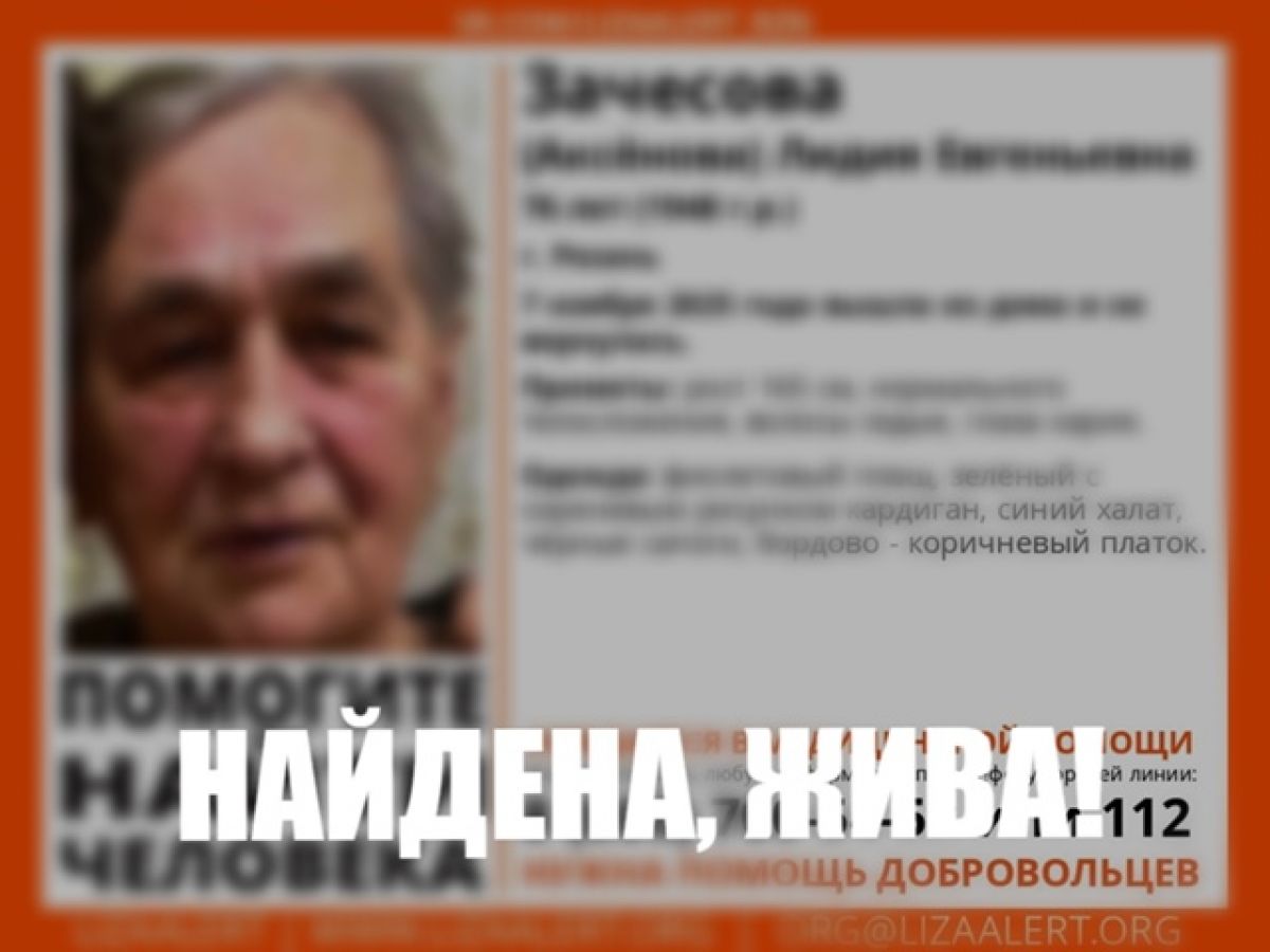 Лидия Зачесова найдена. Она жива. Волонтеры не сообщают подробности поисков.