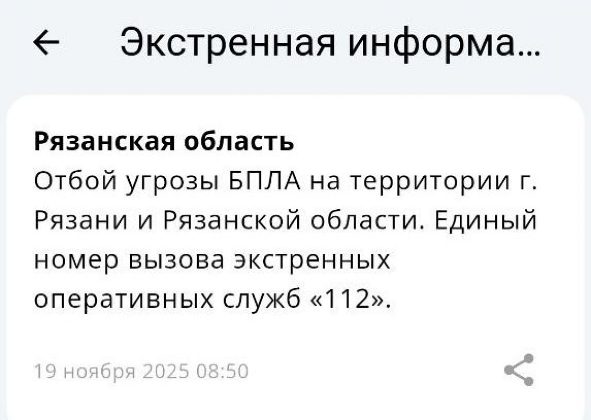 Утром 19 ноября в Рязанской области отменили угрозу БПЛА