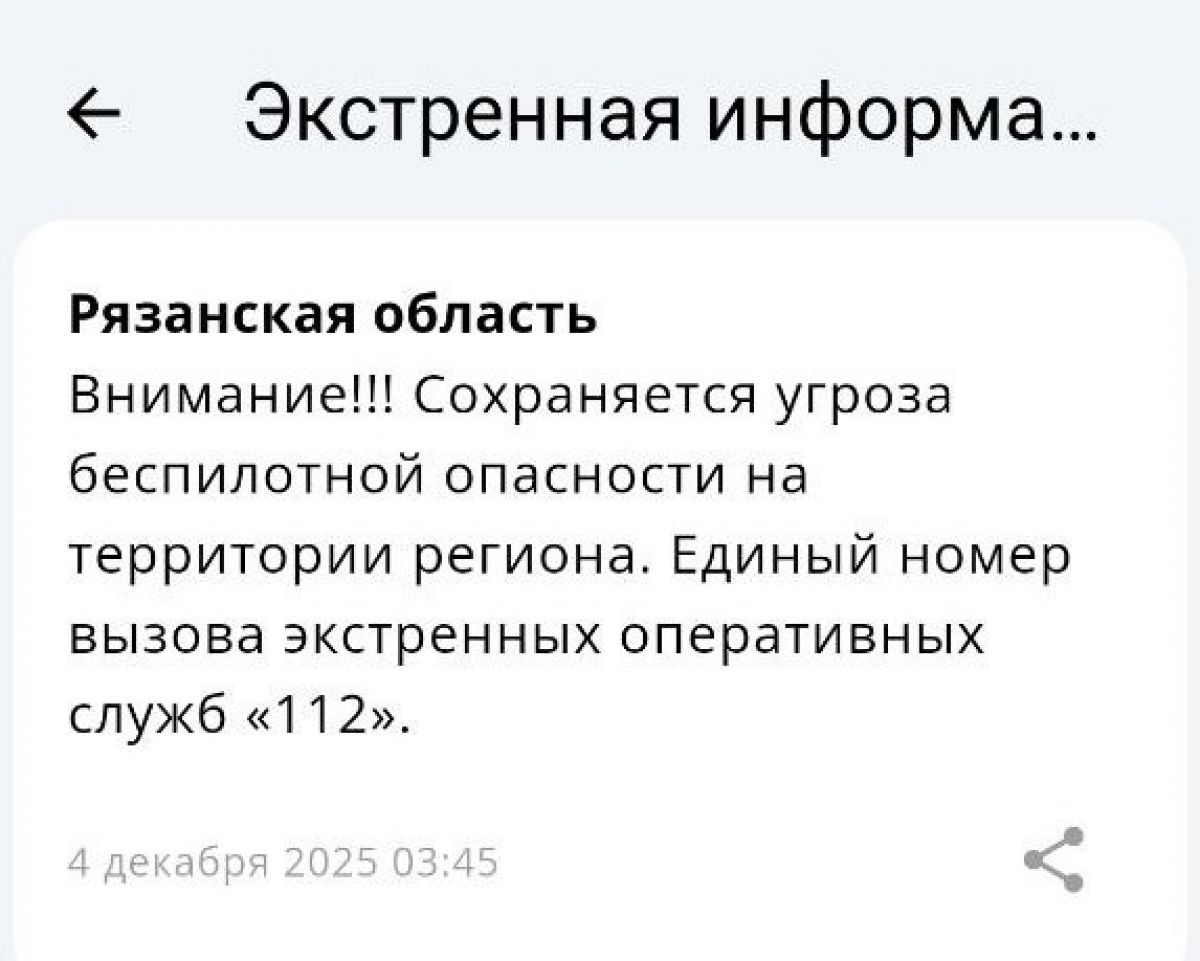 В Рязанской области сообщили о сохранении угрозы БПЛА 4 декабря