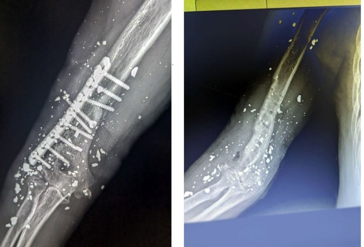 Сразу же после травмы мужчине провели экстренную операцию — первичную обработку раны и накостный остеосинтез плечевой кости. Однако возникли осложнения: появились симптомы повреждения лучевого нерва и началось нагноение вокруг имплантированной металлической конструкции. В течение проводимого лечения ситуация осложнилась формированием хронического свища с постоянным выделением гноя в области фиксации металла. Пациента мучили сильные боли. Сильные боли.