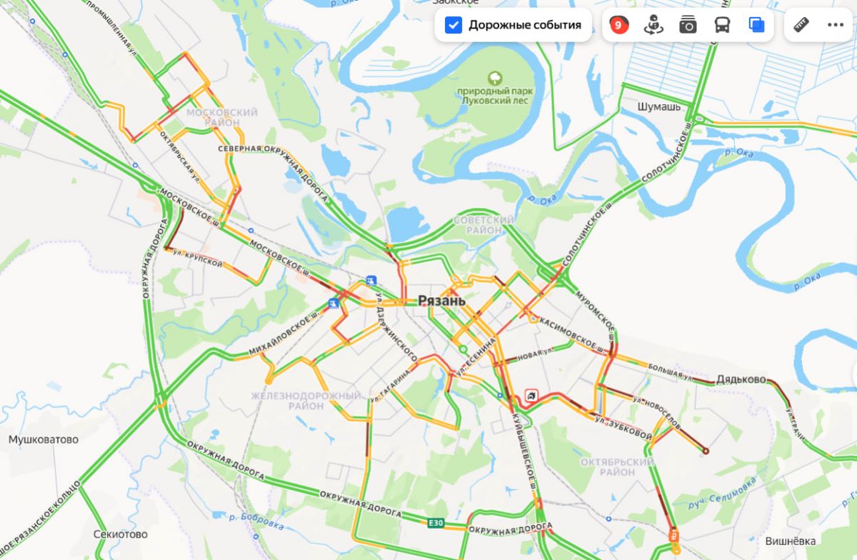Затруднено движение во многих районах города, а также на выезде из села Дядьково. Пробки указаны на улицах: Большая, Новоселов, Зубковой, Шереметьевская, Песоченская, Соколова, Героев десантников, Новая, Касимовское, Московское, Куйбышевское шоссе, Есенина, Спортивная, Черновицкая, Чапаева, Маяковского, Дзержинского, Юбилейная, Крупской, Октябрьская, Пирогова, пр-д Шабулина, Станкозаводская, Каширина, Грибоедова, Восточная окружная дорога и другие участки дорог.