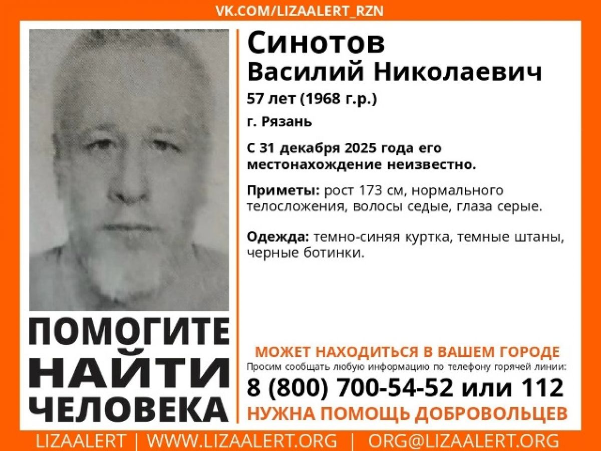 В Рязани волонтеры объявили поиски пропавшего 31 декабря 2025 года 57-летнего Василия Синотова. Об этом сообщают добровольцы поискового отряда «ЛизаАлерт» Рязанской области.