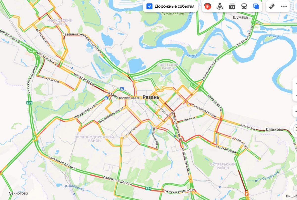 Затруднено движение транспорта на улице Грачи (село Дядьково), в Рязани на улицах: Большая, Сережина гора, Новоселов, Полевая, Тимакова, Кальная, Грибоедова, Зубковой, пр-д Яблочкова, Восточная окружная дорога, Северная окружная дорога, Окружная дорога, Дзержинского, Спортивная, Новая, Циолковского, Есенина, Пролетарская, Каширина, Юбилейная, пр-д Шабулина, Бирюзова, Станкозаводская, Куйбышевское, Солотчинское, Московское, Касимовское шоссе и на других улицах.