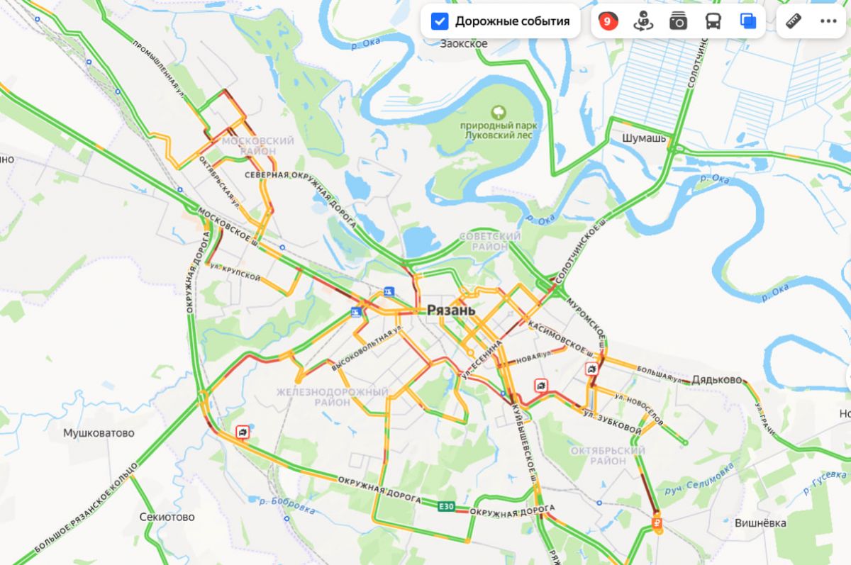 Утром 30 января на улицах Рязани образовались пробки до девяти баллов и произошли несколько аварий. Это следует из сервиса «Яндекс. карты».