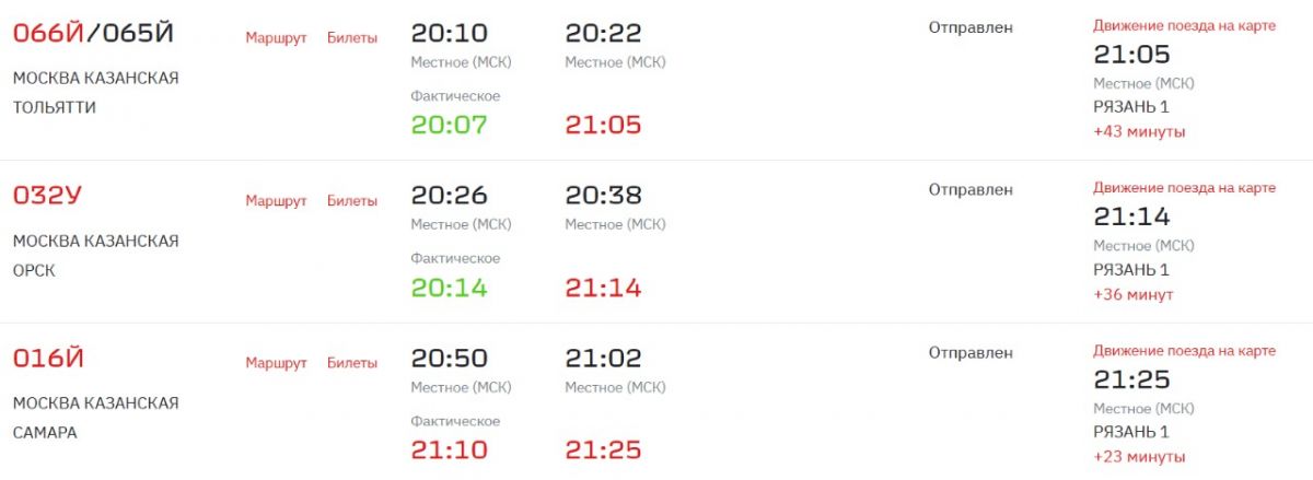 Например, электричка Ясаково–Рязань, пришла с задержкой на 60-80 минут. Несколько поездов из Москвы опаздывали на 20 и более минут. А у электрички Рязань-Голутвин, которая должна была отправиться в 20:04, до 21:30 стоял статус «Ожидается отправление».