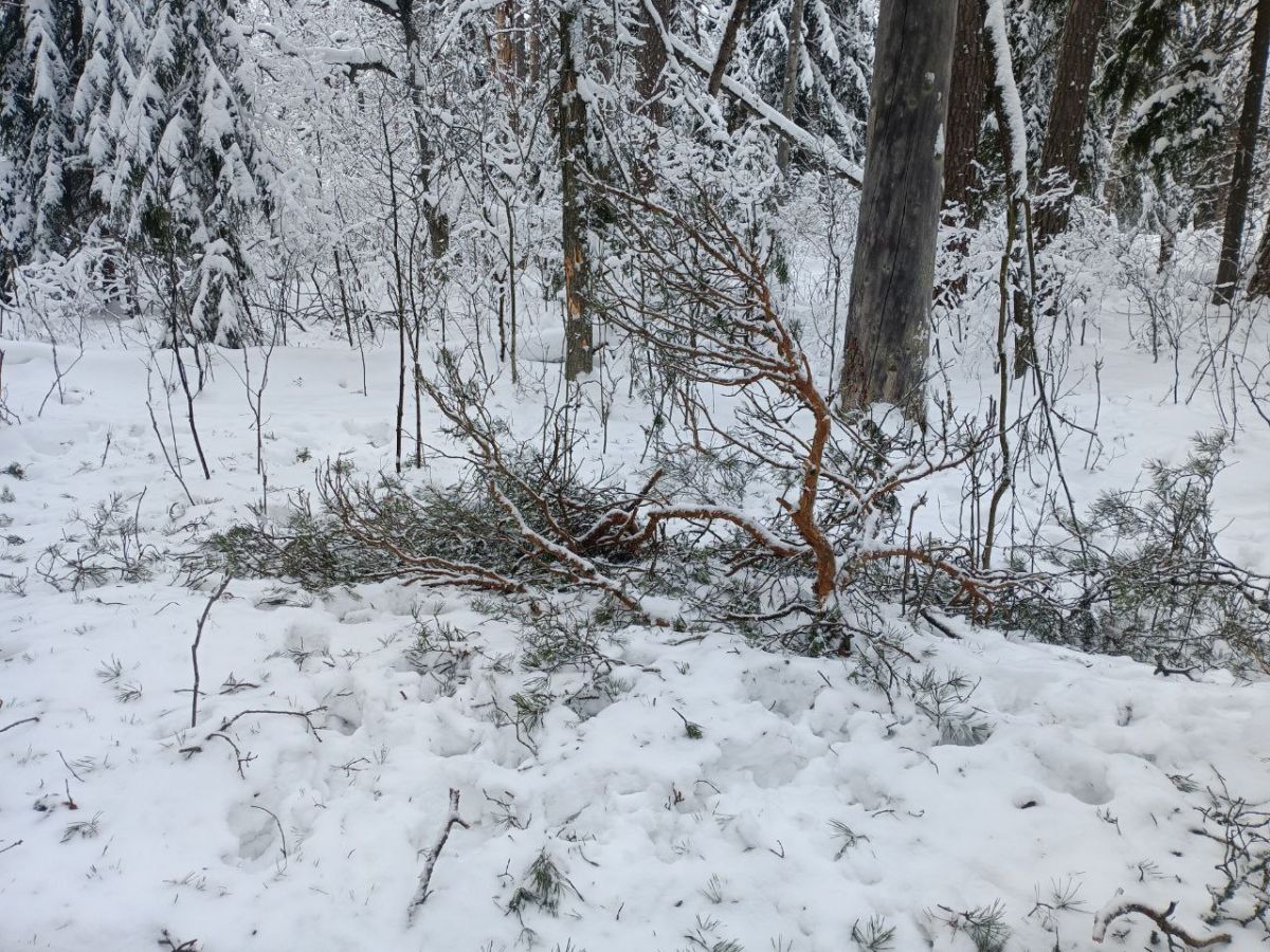 Научный сотрудник Окского заповедника подчеркнула, что настоящей зимой под тяжестью снега упало много деревьев и веток, и лоси с удовольствием объедают с них кору и хвою, лёжа в снегу.