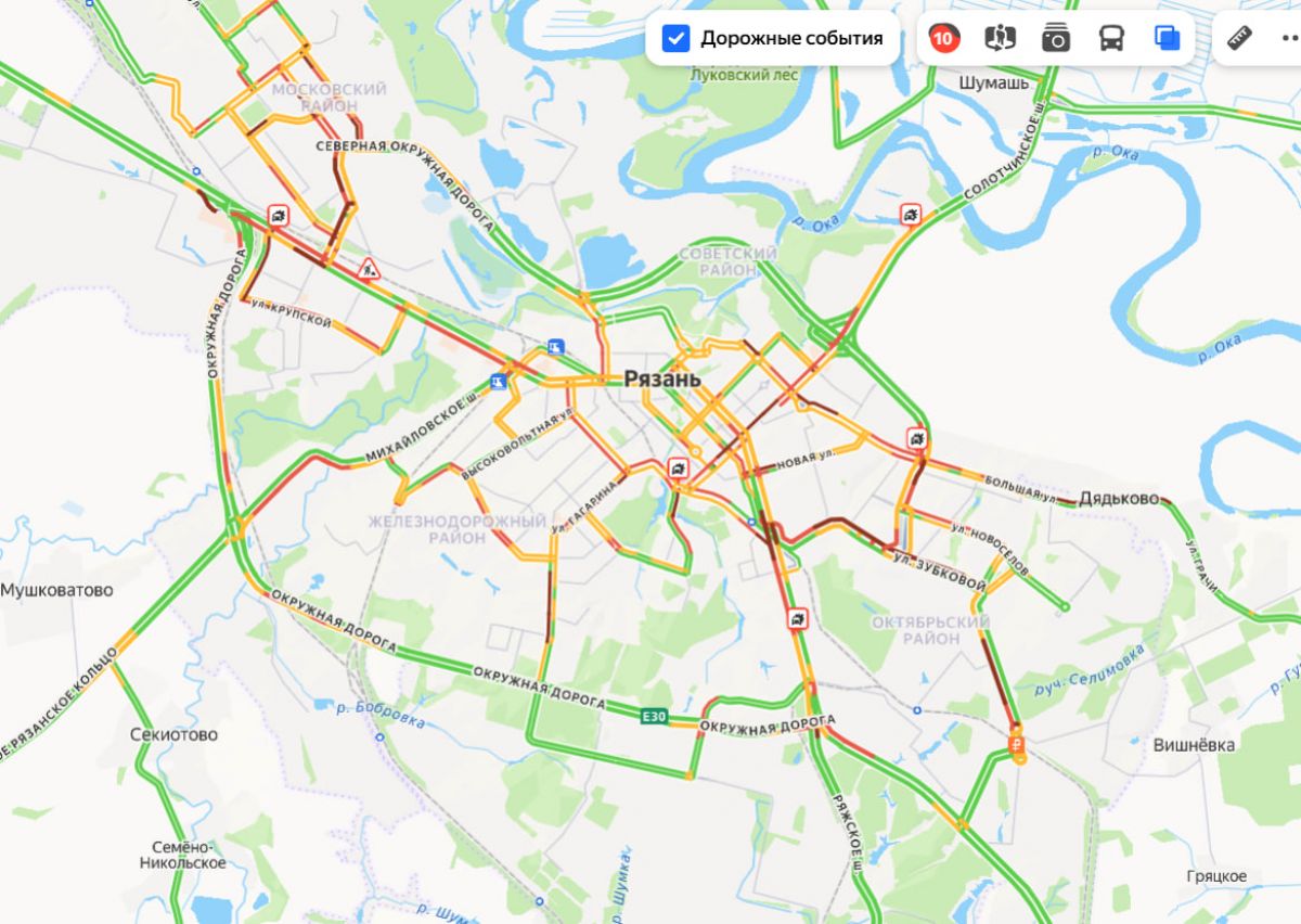 Очередное утро начала рабочей недели начинается с десятибалльных пробок и аварий на дорогах Рязани. Это следует из сервиса «Яндекс. карты».