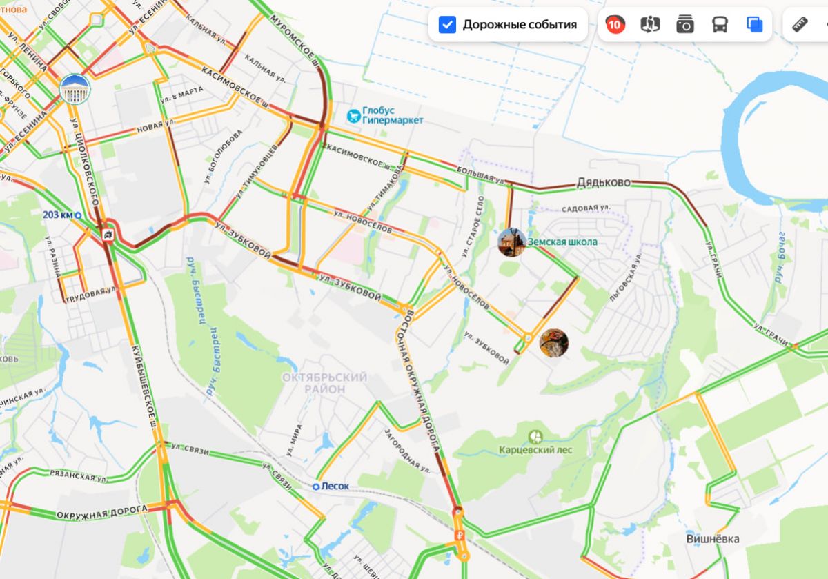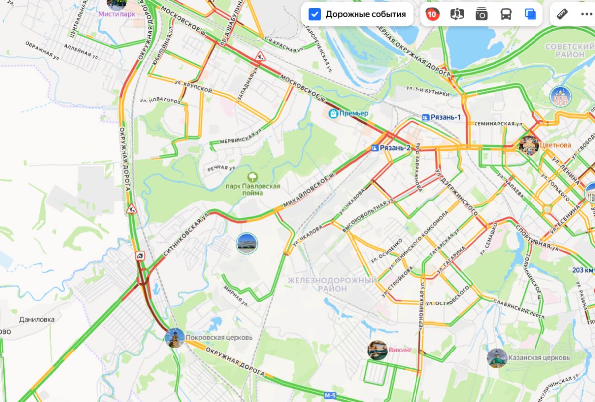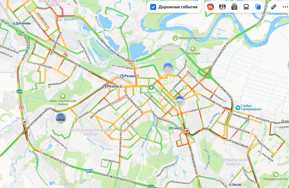 Начало новой рабочей недели встречает жителей Рязани пробками в десять баллов и авариями на дорогах. Это следует из сервиса «Яндекс. карты».