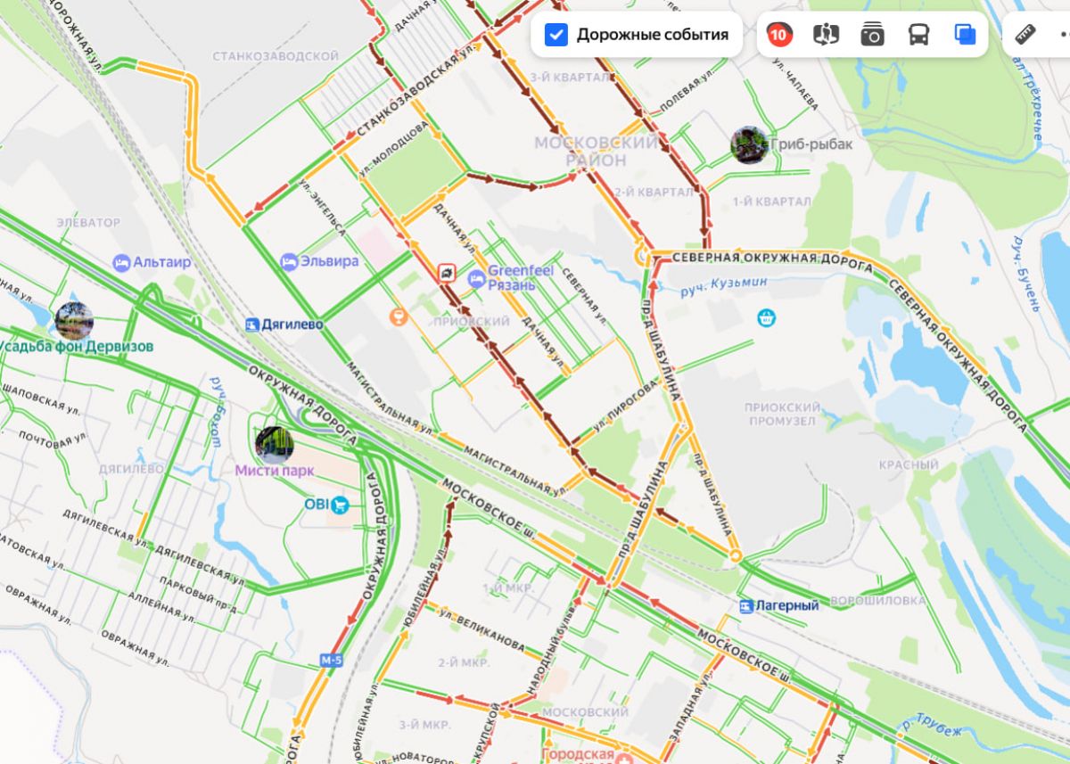 Затруднено движение транспорта на улице Грачи (село Дядьково), в Рязани на улицах: Большая, Сережина гора, Новоселов, Советской армии, Тимакова, Тимуровцев, Кальная, Зубковой, пр-д Яблочкова, Восточная окружная дорога, Окружная дорога, Трудовая, Северная окружная дорога, Черновицкая, Рязанская, Дзержинского, Спортивная, Чкалова, Гагарина, Новая, Горького, Циолковского, Каширина, Петрова, Чапаева, Высоковольтная, Весенняя, Есенина, Юбилейная, Космонавтов, Бирюзова, Княжье поле, Станкозаводская, пр-д Шабулина, Западная, Интернациональная, Куйбышевское, Солотчинское, Муромское, Московское, Михайловское, Голенчинское, Касимовское, Ряжское и на других улицах.