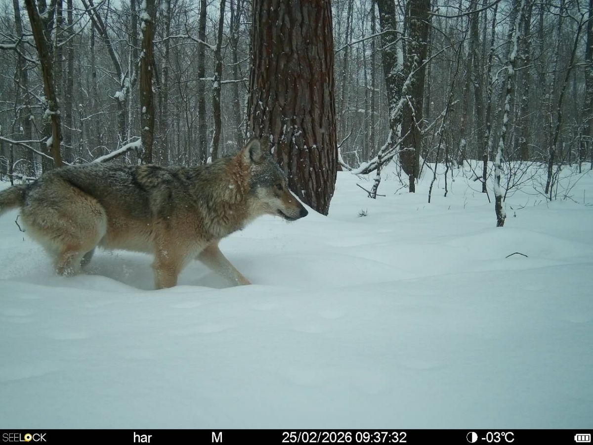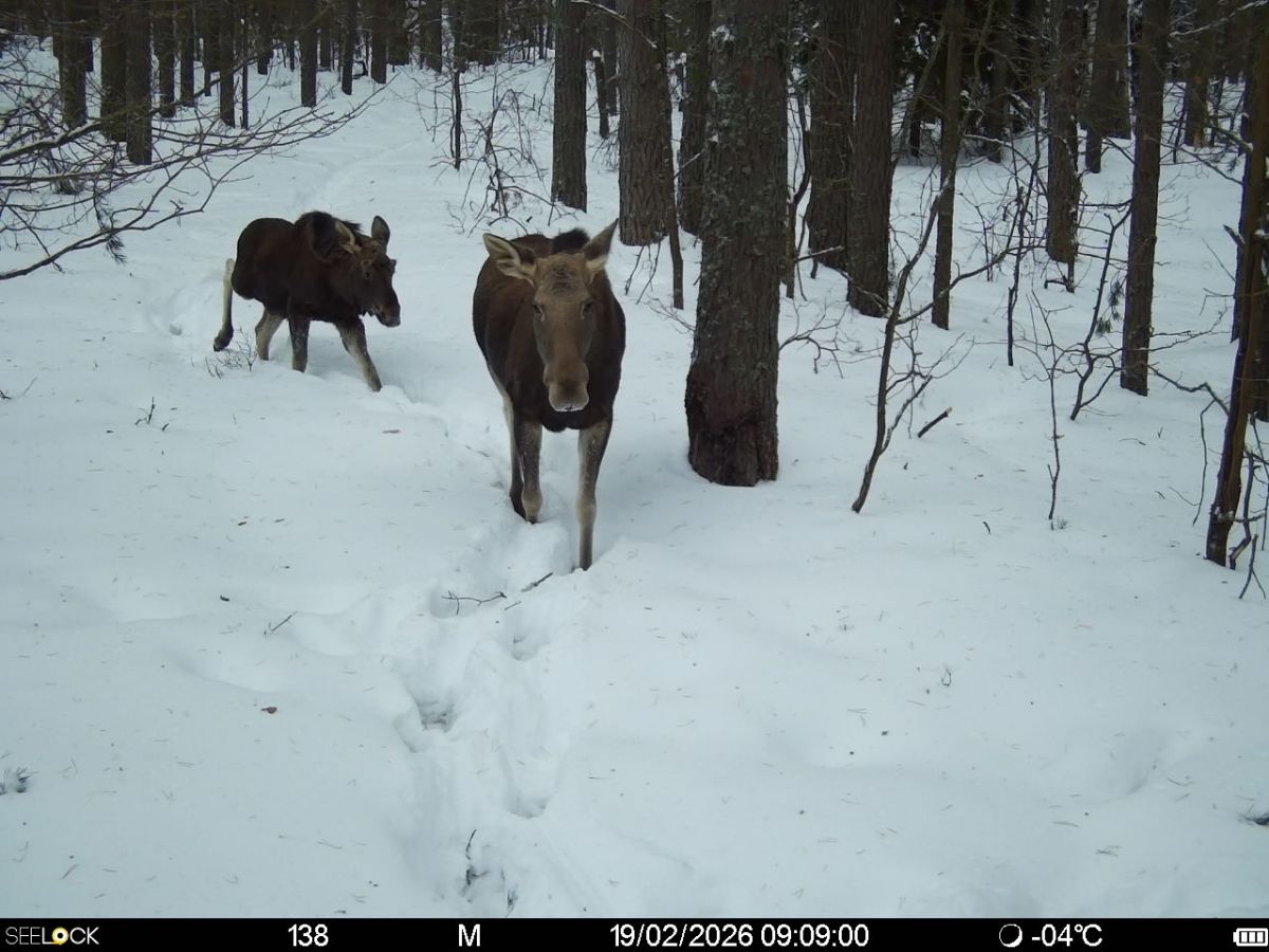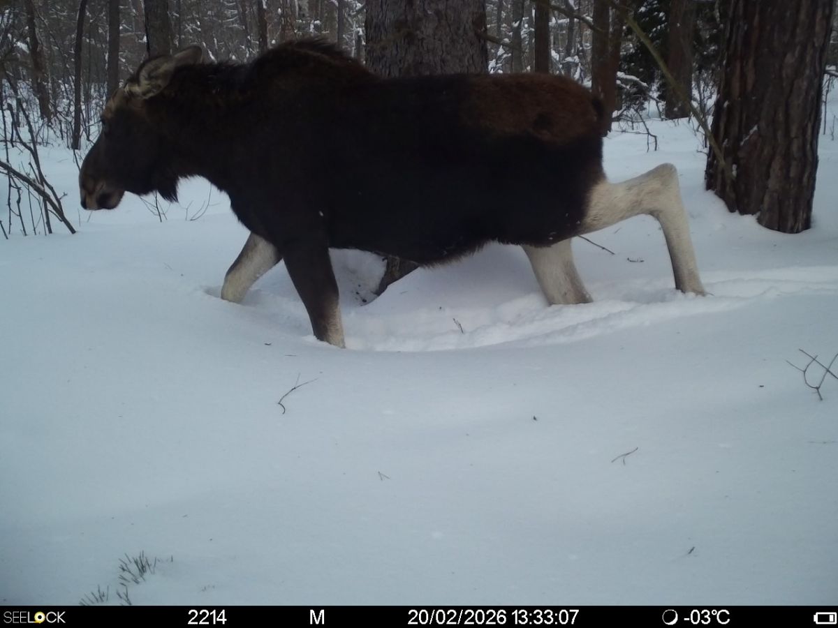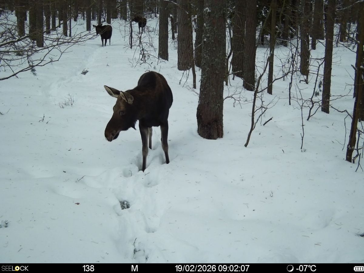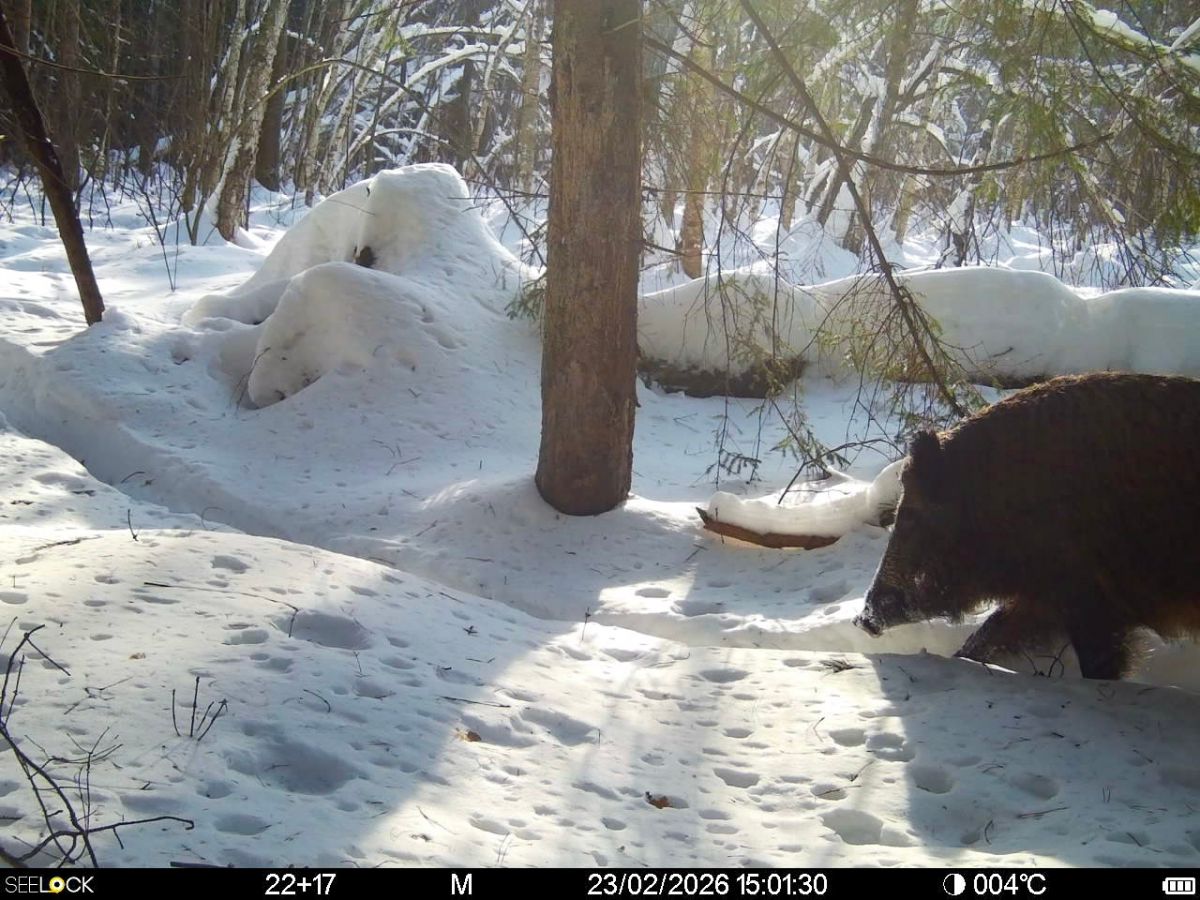 В этот раз запечатлеть удалось только лосей, волка и кабана. Животные перебираются через сугробы, высота снежного покрова в заповеднике превысила один метр.