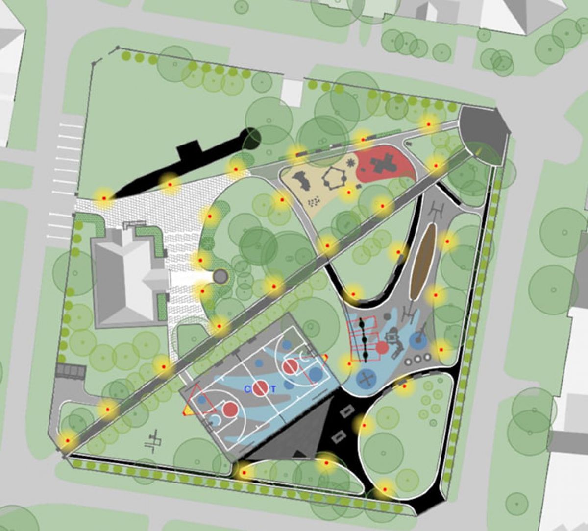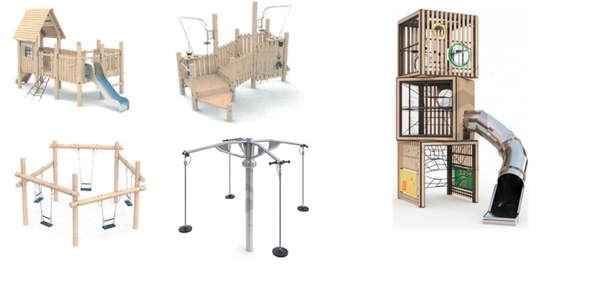 - детской площадки для школьников: мягкие покрытия для безопасной игры, детское оборудование для возраста от 7 до 14 лет (большие горки, канатные комплексы, «гигантские шаги»), зоны для отдыха,