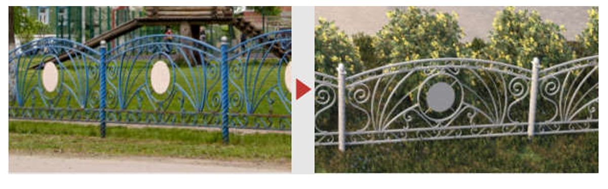 Проектом предлагается сохранить узнаваемые элементы, адаптируя их под новую палитру. Например, существующий забор остаётся, но перекрашивается из ярко-синего в спокойный серо-белый, соответствующий характеру обновлённого парка.