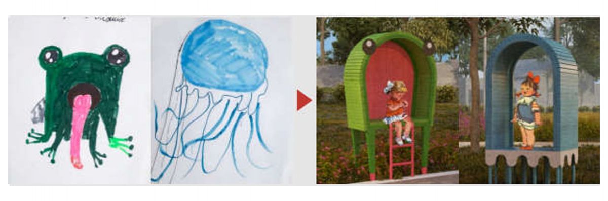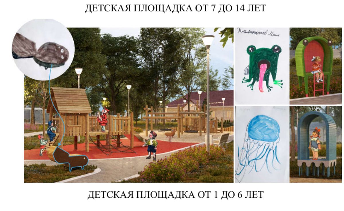 - детской площадки для дошкольников: мягкие покрытия для безопасной игры, игровое оборудование для возраста до 7 лет (низкие горки, качели, качалки, песочницы, элементы геопластики и др.), зона отдыха для родителей, малые архитектурные формы на основе детских эскизов,