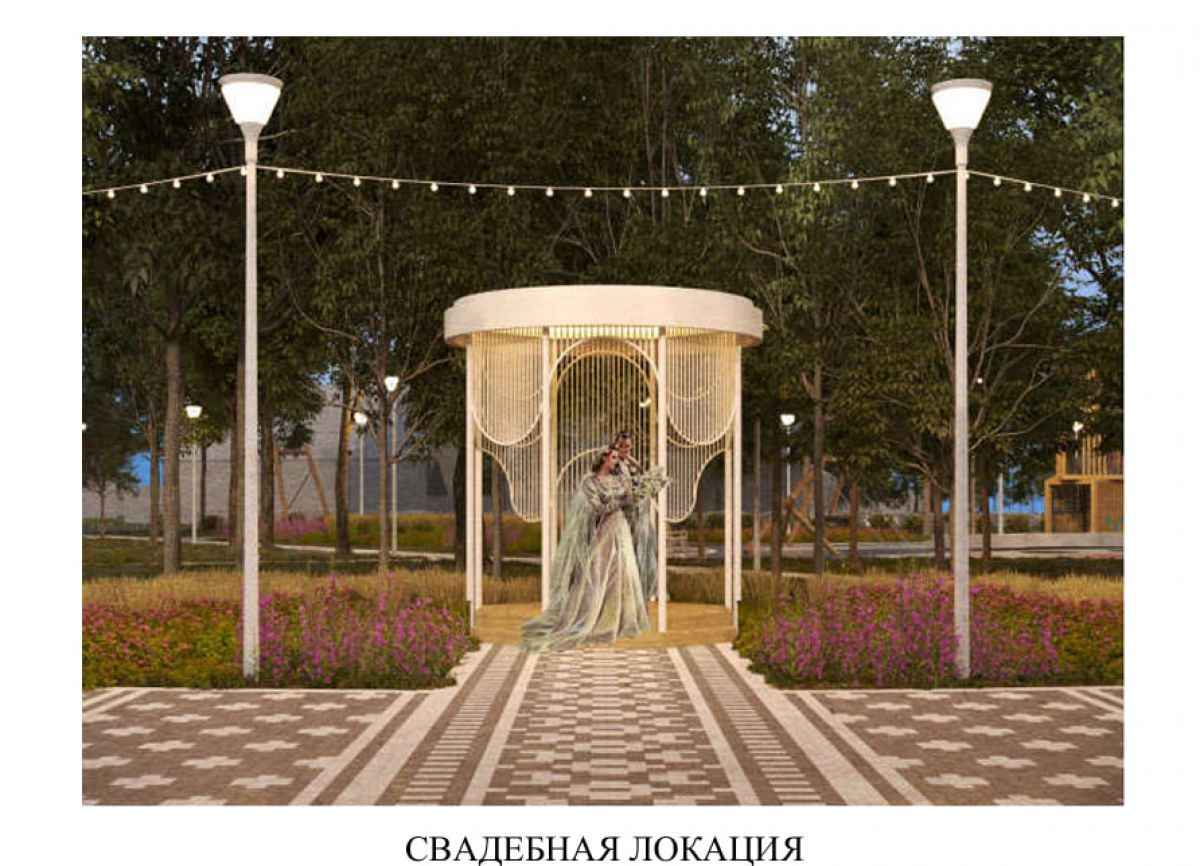 Здесь уже выделены зоны, которые ожидают благоустройства: детские площадки, спортивная площадка, площадь у ЗАГСа, зона отдыха. А также фотозона, где традиционную композицию с сердцами планируется дополнить ажурной беседкой и парадным мощением.