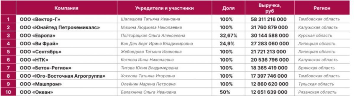Представленная группа владелиц бизнеса неоднородна по своему составу, рейтинг носит условный характер, но в целом даёт представление о присутствии женщин в бизнесе. В основе рейтинга — последние доступные данные по выручке за отчетный 2024 год, размещенные на сервисе Rusprofile.