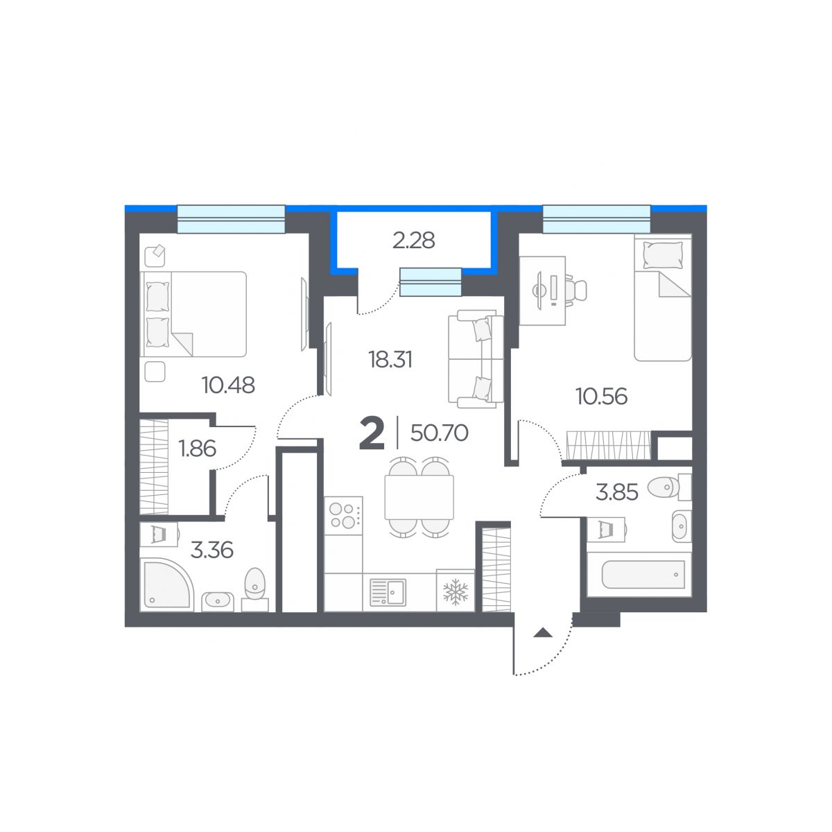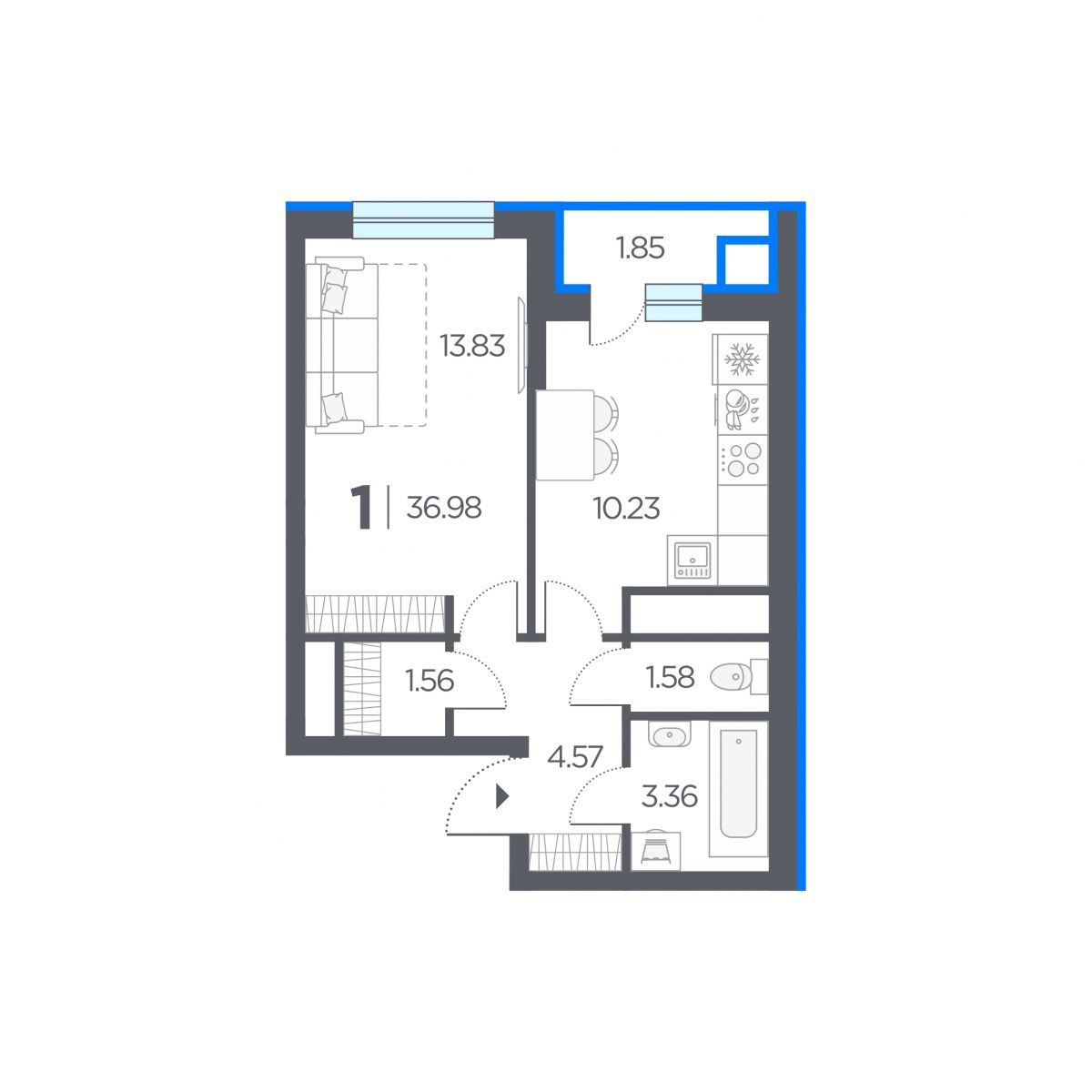 Так, ее можно оформить на 1-комнатную квартиру 36,98 м2 с раздельным санузлом в ЖК Новые горизонты.