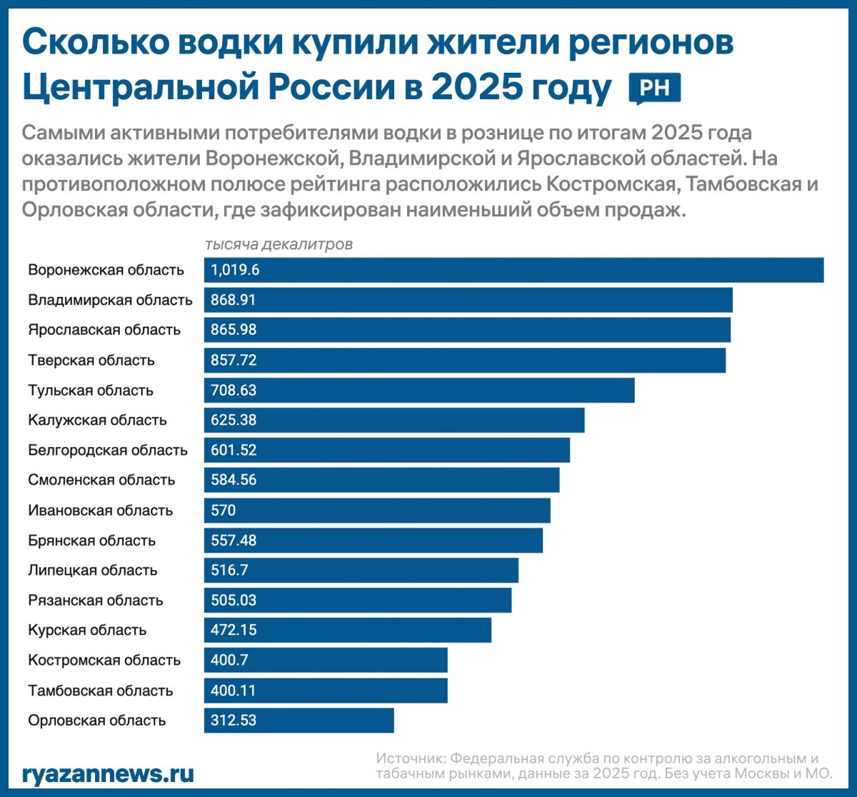 В 2025 году жители Рязанской области приобрели 505 тысяч декалитров водки. Это на 3,3% меньше, чем в 2024 году. Такие данные опубликовала Федеральная служба по контролю за алкогольным и табачным рынками.