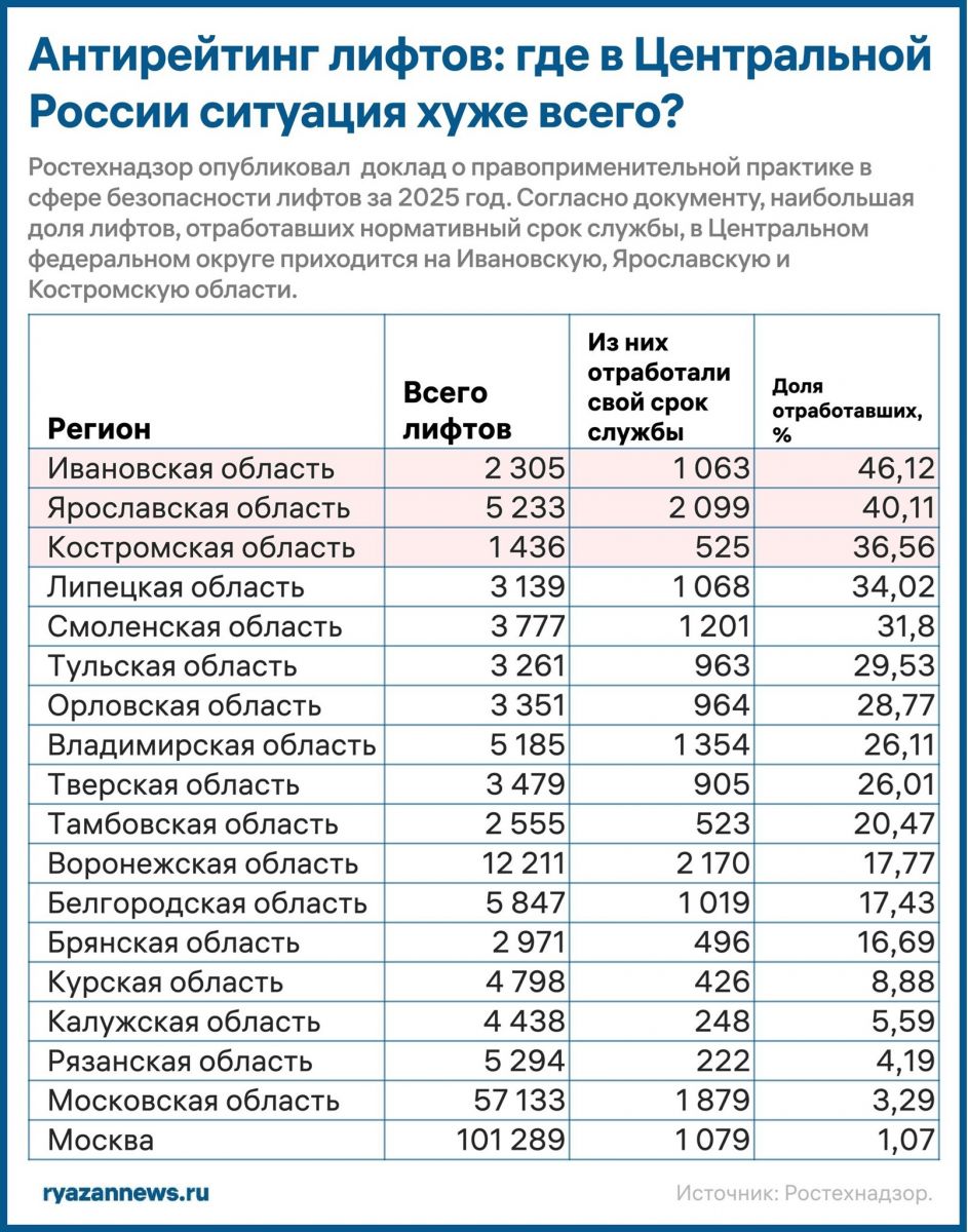 Согласно докладу ведомства за прошлый год, из почти 600 тысяч лифтов, работающих в стране, более 84 тысяч исчерпали свой ресурс. По данным исследования, в Рязанской области показатель не самый высокий в Центральном федеральном округе. Регион занял третье место. Самая низкая доля отработавших свой предельный срок эксплуатации и требующих ремонта лифтов в Москве (1,07 процент) и в Московской области (3,29 процента).