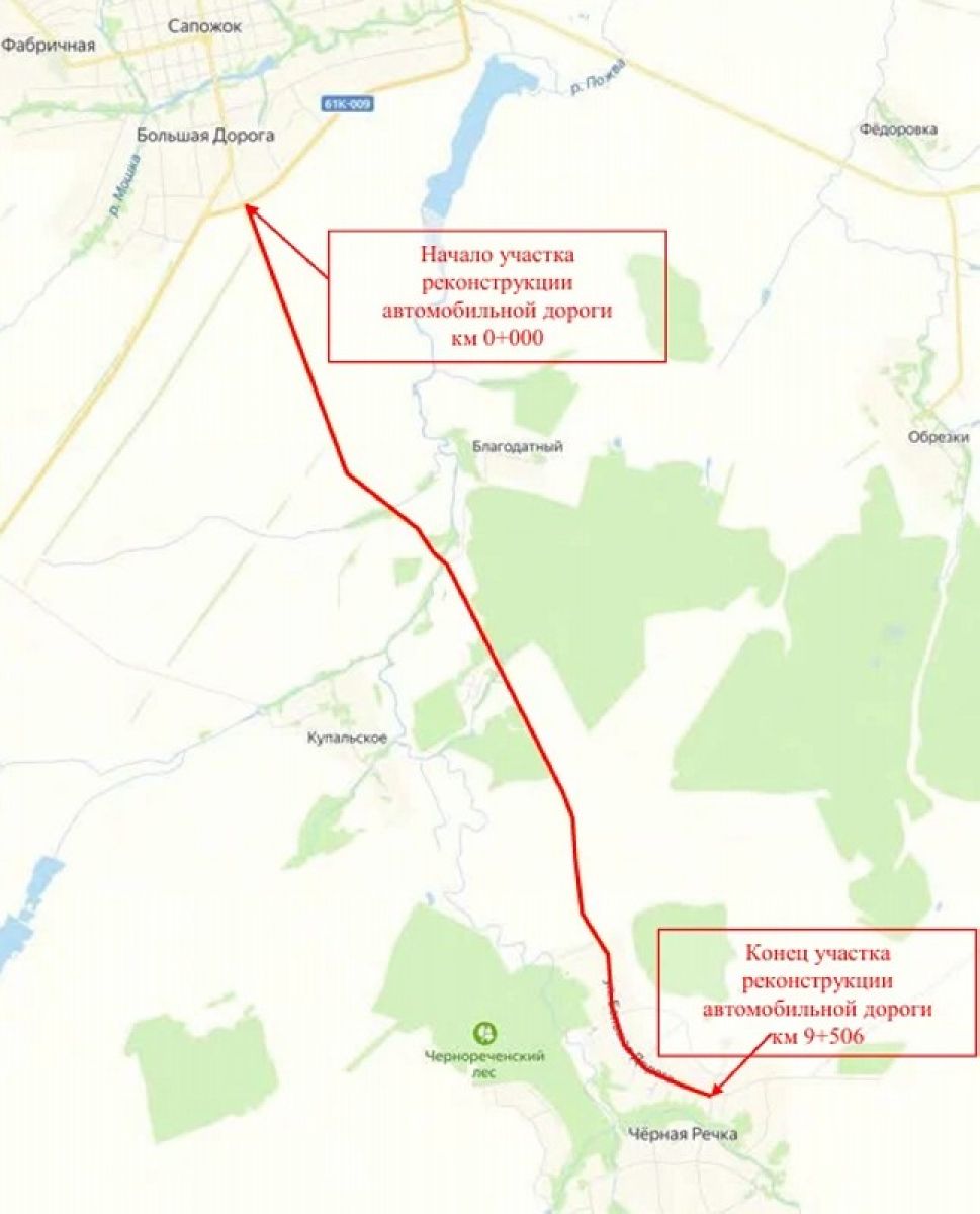 В рамках контракта необходимо провести реконструкцию автомобильной дороги Сапожок - Черная Речка в Сапожковском округе. Протяженность ремонтируемого участка составляет около 9,07 км. Дорога двухполосная. Начало участка реконструкции – ПК 0 + 40 (конец съезда с автодороги Ряжск – Касимов). Конец участка реконструкции – ПК 91 + 10 в с. Черная Речка.