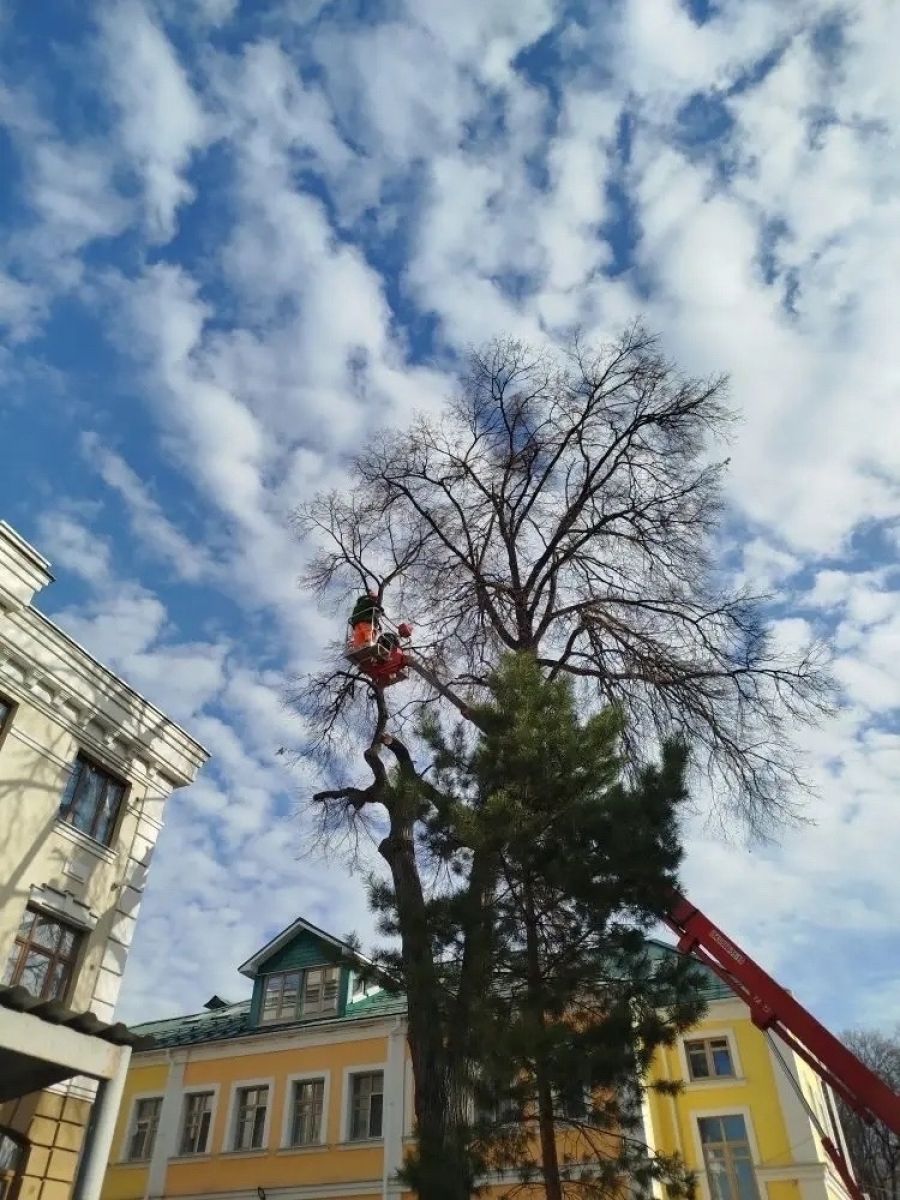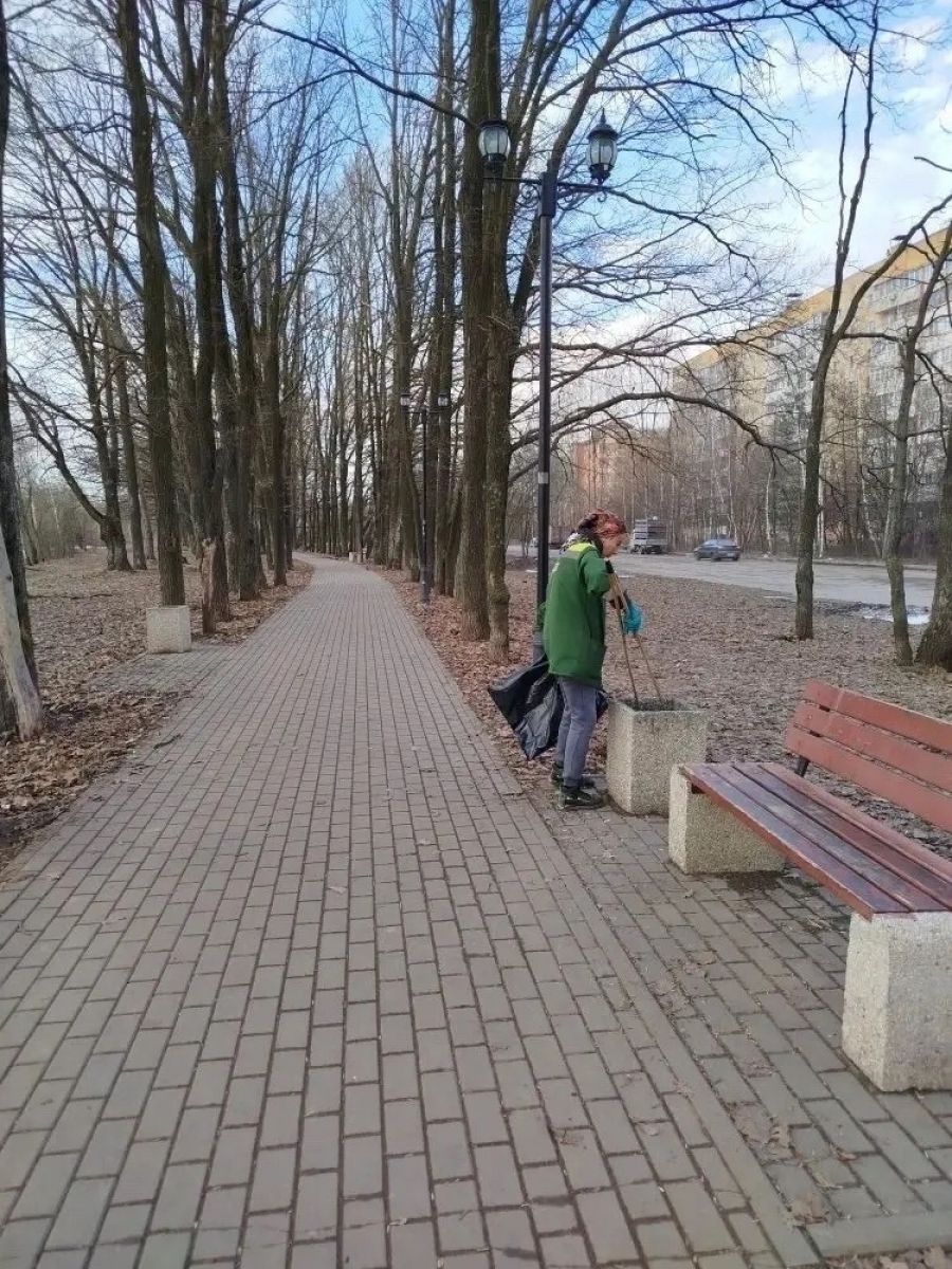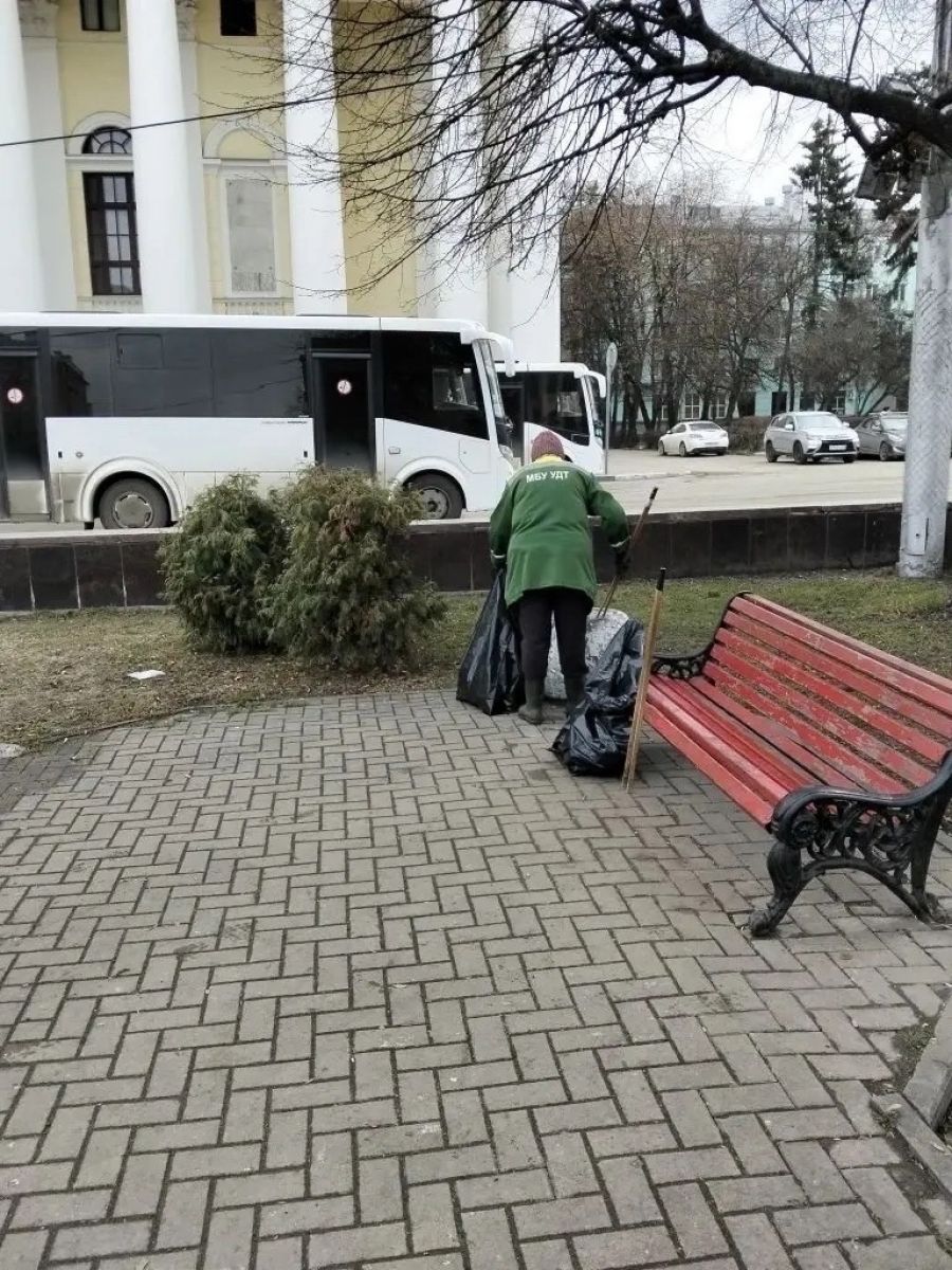 Работы ведутся и в общественных пространствах. Управление по делам территорий занимается уборкой парков и скверов: специалисты очищают урны, подметают дорожки как вручную, так и с использованием техники, проводят санитарную обрезку деревьев и стрижку туй.