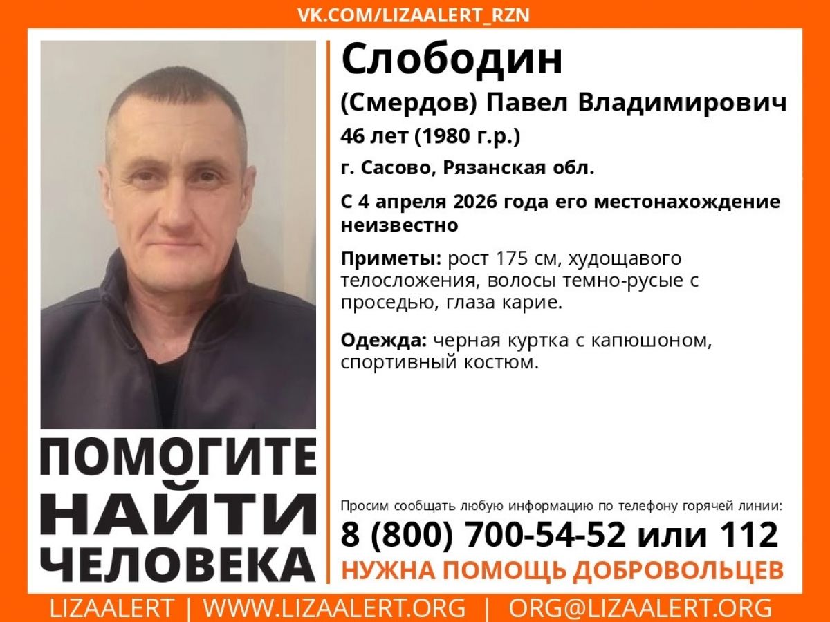 В Рязанской области волонтеры объявили поиски пропавшего 4 апреля 2026 года в городе Сасово Павла Слободина. Об этом сообщают добровольцы поискового отряда «ЛизаАлерт» Рязанской области.