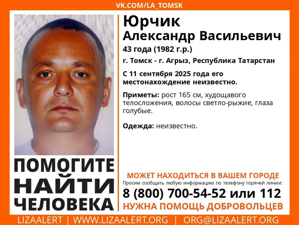 Рязанские волонтеры присоединились к поиску пропавшего 43-летнего Александра Юрчика. Он может находиться в нашем регионе, в Томске, в городе Агрыз республики Татарстан. Об этом сообщают добровольцы поискового отряда «ЛизаАлерт» Рязанской области.