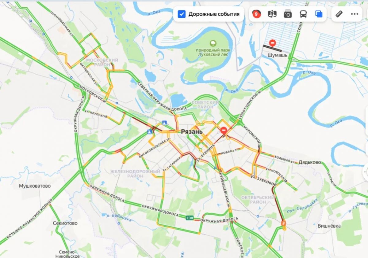 Затруднено движение транспорта на улице Грачи (село Дядьково), в Рязани на улицах: Большая, Сережина гора, Новоселов, Сережина Гора, Тимакова, Советской армии, Тимуровцев, Кальная, Грибоедова, Зубковой, пр-д Яблочкова, Восточная окружная дорога, Северная окружная дорога, Окружная дорога, Трудовая, Дзержинского, Спортивная, Гагарина, Новая, Циолковского, Есенина, Пролетарская, Каширина, Юбилейная, пр-д Шабулина, Бирюзова, Станкозаводская, Куйбышевское, Солотчинское, Московское, Касимовское шоссе и на других улицах.