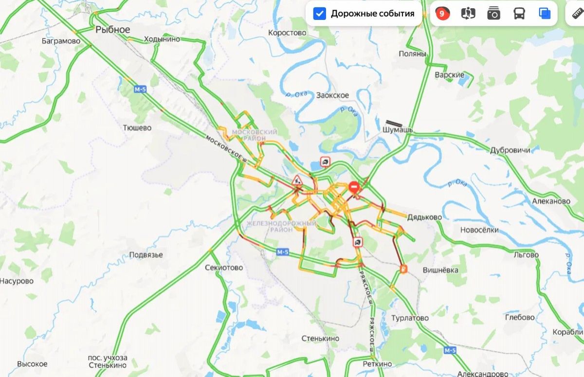 Затруднено движение транспорта в Рязани на улицах: Новоселов, Тимакова, Советской армии, Тимуровцев, Кальная, Грибоедова, Зубковой, пр-д Яблочкова, Восточная окружная дорога, Северная окружная дорога, Окружная дорога, Трудовая, Дзержинского, Черновицкая, Нахимова, Спортивная, Гагарина, Новая, Циолковского, Есенина, Вознесенская, Пролетарская, Каширина, Юбилейная, пр-д Шабулина, Бирюзова, Куйбышевское, Солотчинское, Московское, Касимовское, Голенчинское, Михайловское шоссе, и на других улицах.